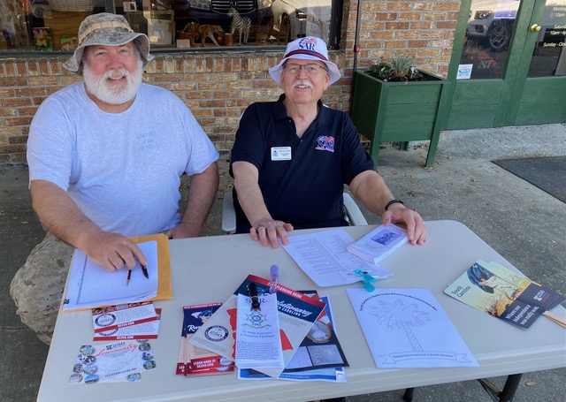 Fort Dorchester Chapter members Tim Hilton, Stephen Worsham, Danny Miante, Jeff Ball and Ken Buchanan volunteered at the Flowertown Festival manning a SAR booth recruiting, educating on the American Revolution and providing SC250 handouts. Norm Garland, John Gordon, Don Doud and Steven Dimascio also helped out in the planning.